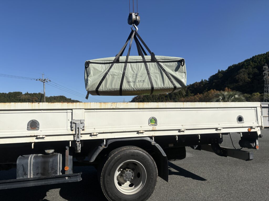 長尺の吊りベルトは、ユニックでの吊り上げ作業に対応するため、本体を四方向から支える4本構造を採用。荷重を均等に分散し、吊り上げ時の安定性を確保します。