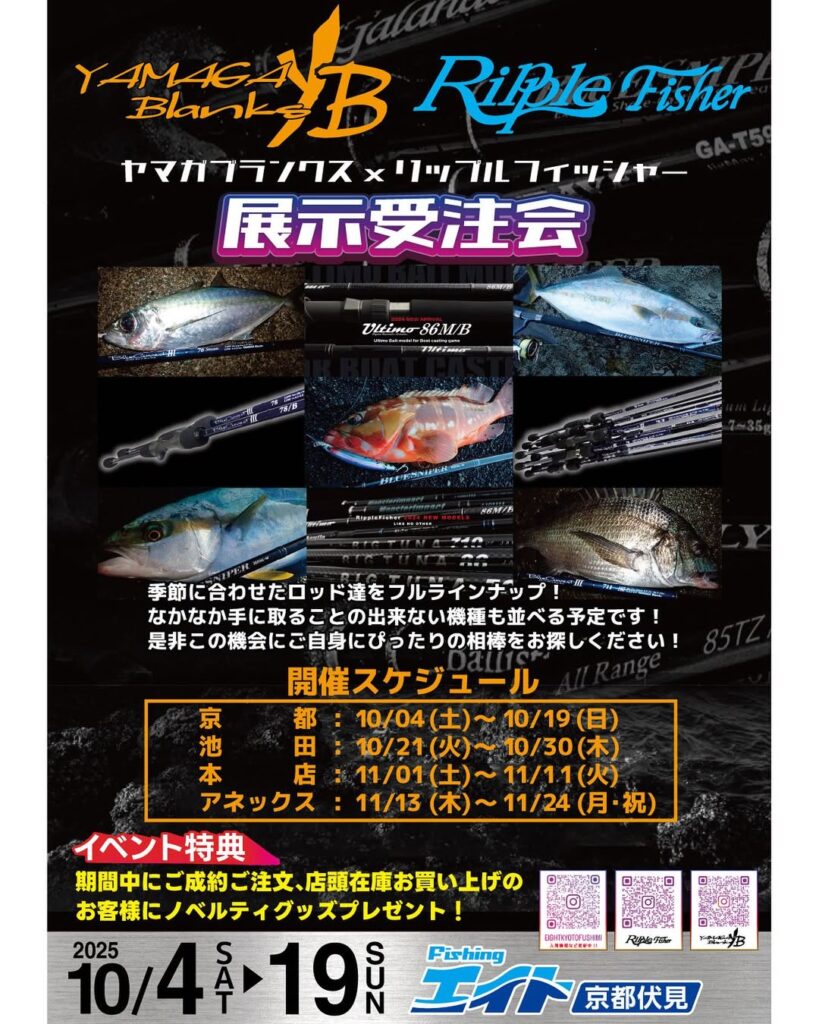 京都府京都市の【フィッシングエイト 京都伏見店】さまにて RippleFisher & YAMAGA Blanks の展示受注会 が開催されます。