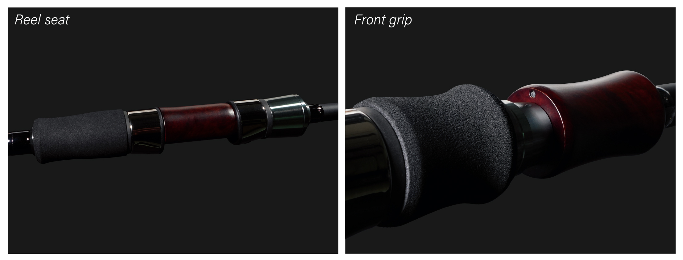 リールシートは、Fuji製SKDPSとオリジナルウッドシートの組み合わせで構成されています。ウッドシートを採用することでシート部の段差を解消し、違和感なく手に馴染む形状としたことで、長時間ホールドし続けるシーバスゲームにおいても疲労を軽減します。デザイン性と機能性を両立させたオリジナル設計のリールシートです。